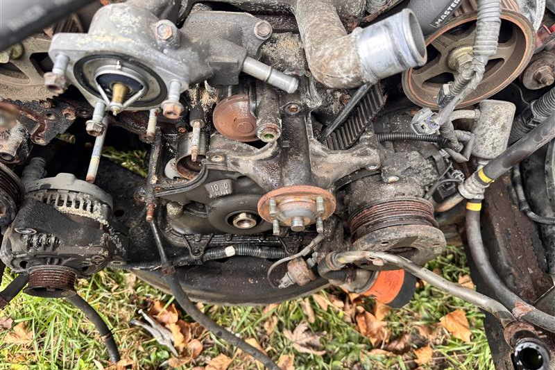 Tearing down the engine wasn’t bad. The bumper was still off from the flat tow. Radiator fan, shroud, radiator out. Serpentine belt, AC compressor, alternator, power steering pump. Timing cover, timing cov… frick. Broken bolt. Okay. Anyway, timing cover. Drill, extractor… frick. broken extractor. Drill, tap, thread adapter. Keep going.